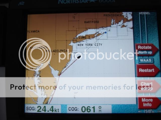 We arrived in Montauk today at 2:05. It was just an unbelievable trip. I would never have imagined that we could have run 701 miles from NC to NY in just 3 days. The weather could not have been any better. These were the best sea conditions I have ever run for an extended period.